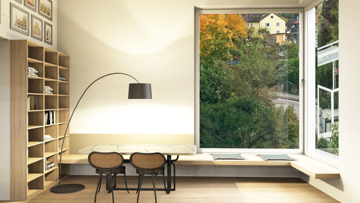 Un bellissimo vecchio maso situato nella pittoresca Eppan, con una piccola casetta separata che desidera risplendere di nuova luce. Il primo passo di questo progetto è stato definire la disposizione degli spazi. La cliente vive da sola e ama ricevere molte visite. Per lei era importante avere uno spazio che offrisse tanto posto per i suoi amici, mentre un soggiorno classico con TV non è una priorità. Così è nata l'idea di creare una cucina con zona pranzo e ulteriori posti a sedere. Al centro della stanza ci sono poltrone, una panca davanti al camino e la scala, sulla quale si può sedere quando ci sono più persone. La scala, quindi, non solo svolge la sua funzione principale, ma offre anche la possibilità di sedersi e crea spazio attorno al comodo camino. Inoltre, la panca al tavolo da pranzo è stata estesa lungo la grande vetrata, dove si può anche leggere un libro e godere della bella vista. Per restituire alla stanza l'altezza originale, la controsoffittatura è stata parzialmente rimossa. Nella zona posteriore si trovano la camera da letto e il bagno, mentre al piano superiore ci sono un ufficio, una sala TV e il bagno per gli ospiti. La scrivania si trova proprio dietro la parete della balaustra, per sfruttare al meglio la luce naturale durante il lavoro. La cliente è proprietaria di numerose foto antiche, che sono sapientemente esposte sulla parete della balaustra. Accanto, una libreria alta offre ampio spazio per tutti i libri della proprietaria.